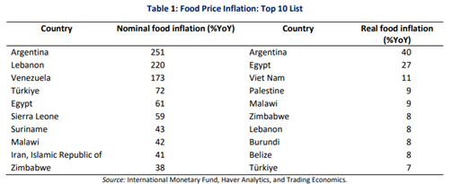 آرژانتین با تورم مواد غذایی 251 درصدی در صدر این لیست قرار گرفته است و پس از آن لبنان و ونزوئلا به ترتیب با تورمهای 220 و 173 سه کشور با بالاترین نرخ تورم غذا هستند.