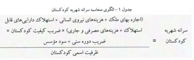 *هزینه اقلام مصرفی (از جمله مواد شوینده بهداشتی، نوشت‌افزار اداری و سایر ملزومات مرتبط) و هزینه امور جاری (از جمله حامل‌های انرژی، اینترنت و تعمیرات و نگهداری وسایل و مانند آن) به اندازه متعارف که معادل ۱۲ درصد مجموع سرانه هزینه اجاره بهای ملک، بهای تمام شده نیروی انسانی کودکستان و نرخ استهلاک دارایی‌ها محاسبه می‌شود.