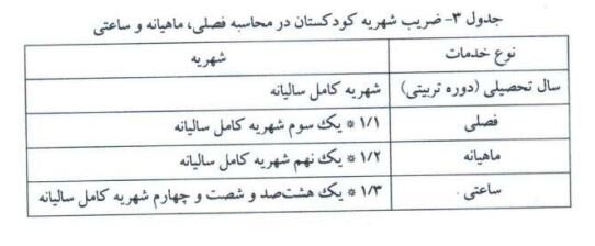*ضریب امتیاز کیفیت کودکستان‌ها براساس آیین‌نامه رتبه‌بندی کودکستان‌ها و پس از اجرای آن تعیین‌ می‌شود. تا تدوین و ابلاغ آیین‌نامه رتبه‌بندی کودکستان‌ها، ضریب مذکور برای همه کودکستان‌ها «یک» محاسبه خواهد شد.
