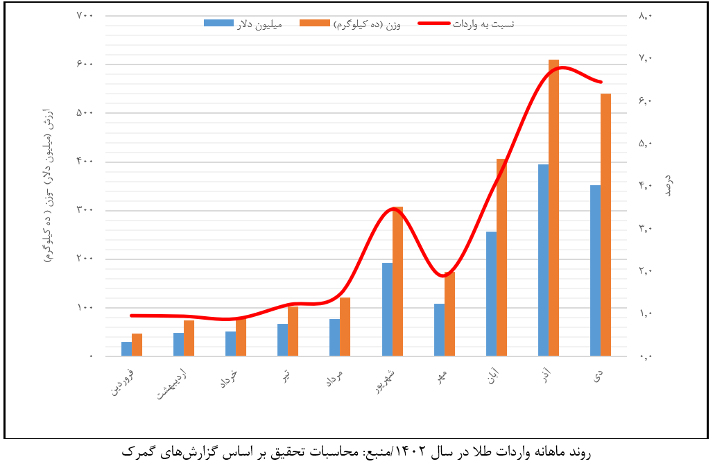 روند ورود طلا به کشور بعد از مصوبههای دولت سرعت گرفت، بهگونهای که از ابتدای امسال تا پایان دیماه ۱۴۰۲، بیش از ۲۴ تن و ۵۰۰ کیلوگرم شمش طلا به ارزش یک میلیارد و ۶۰۰ میلیون دلار از طریق گمرکات کشور وارد شده است. واردات شمش طلا با اختصاص ۲.۹ درصد از ارزش کل واردات کشور در ۱۰ ماهه امسال، رتبه چهارم اقلام عمده کالاهای وارداتی کشور را به خود اختصاص داد. نمودار زیر روند واردات ماهانه شمش طلا از ابتدای سال ۱۴۰۲ را به تصویر کشیده است.