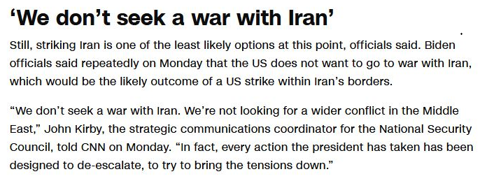 هماهنگ‌کننده ارتباطات راهبردی شورای امنیت ملی کاخ سفید جان کربی روز گذشته (دوشنبه) به شبکه سی ان ان گفت: «ما به دنبال جنگ با ایران نیستیم. ما به دنبال درگیری بزرگ‌تر در خاورمیانه نیستیم. در حقیقت تمامی اقدامات رئیس‌جمهور (بایدن) با هدف تنش‌زدایی و تلاش برای کاهش تنش‌ها طراحی شده است».