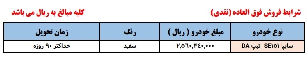 به اطلاع مشتریان محترم و نمایندگیهای مجاز گروه خودروسازی سایپا میرساند ، شرایط فروش فوق العاده سایپا 151 از ساعت 10 صبح روز پنجشنبه مورخ 1402/11/12 از طریق سایت فروش اینترنتی تا زمان تکمیل ظرفیت ، طبق مراحل ذیل جاری خواهد شد: