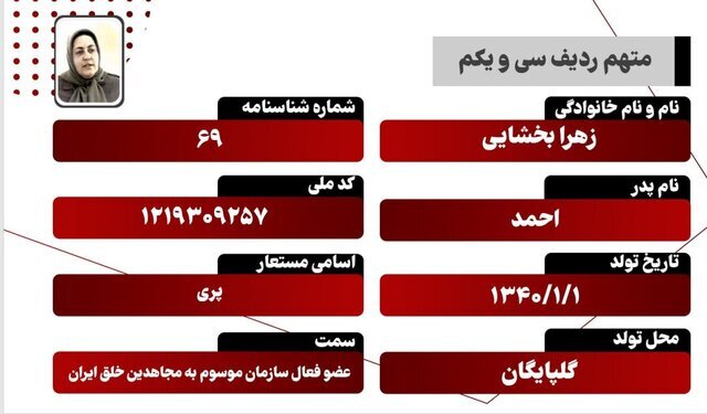 زهرا بخشایی فرزند احمد متهم ردیف سیویکم پرونده است. او در سال ۱۳۶۰، به دلیل عضویت و همکاری با گروهک تروریستی منافقین دستگیر و به یک سال حبس محکوم میشود.