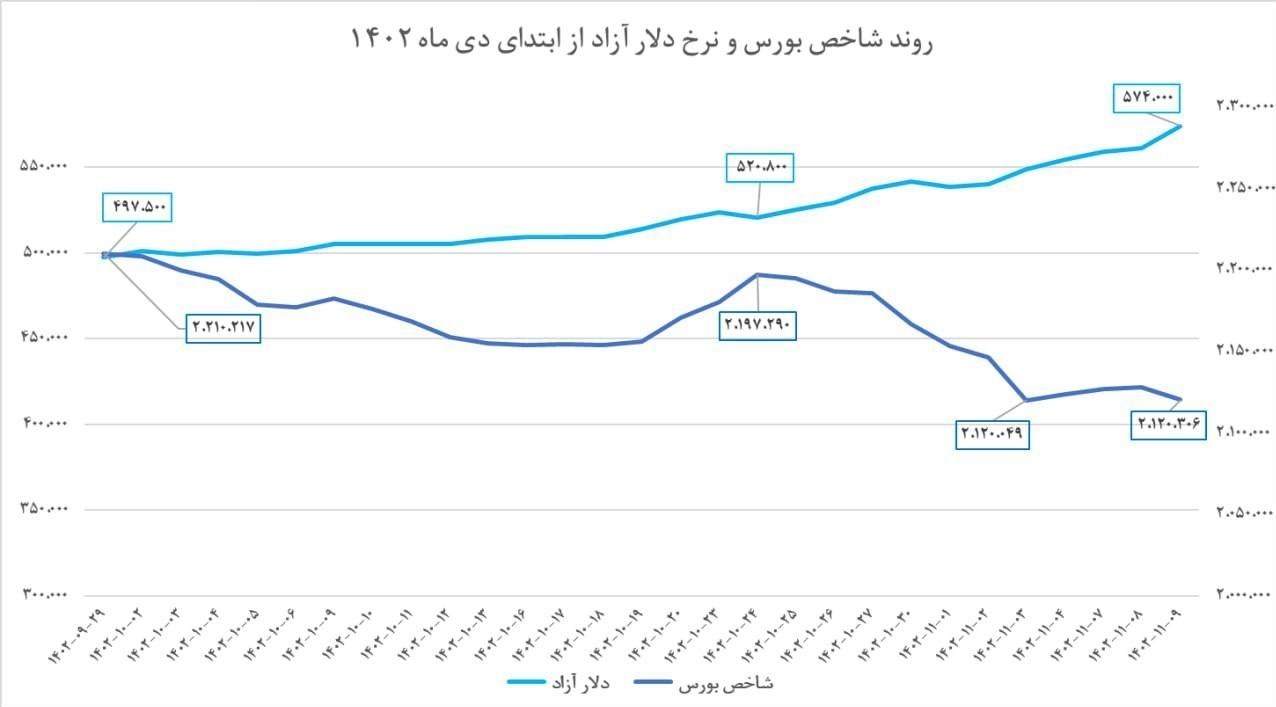بررسی شاخص کل بازار سرمایه از ابتدای آذر ماه به خوبی نشان می دهد که بازار سرمایه بر خلاف سایر بازار ها از جمله بازار ارز و طلا، روندی ریزشی را در پیش گرفته است. اگر چه نرخ ازر تسعیری شرکت های بورسی بر اساس نرخ سامانه مبادله طلا و ارز است اما نکته ای که وجود دارد این است که حتی نرخ ارز رسمی نیز در این مدت رشد اندکی را تجربه کرده است.