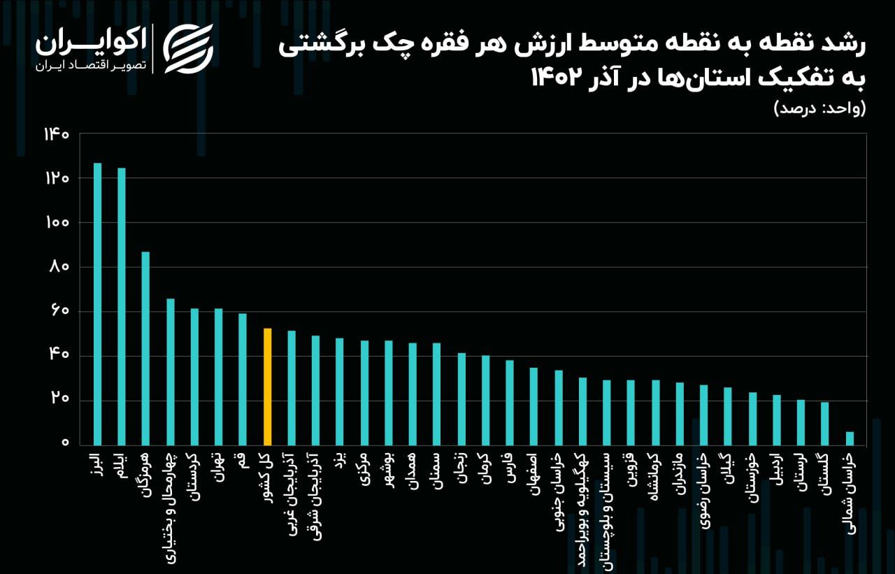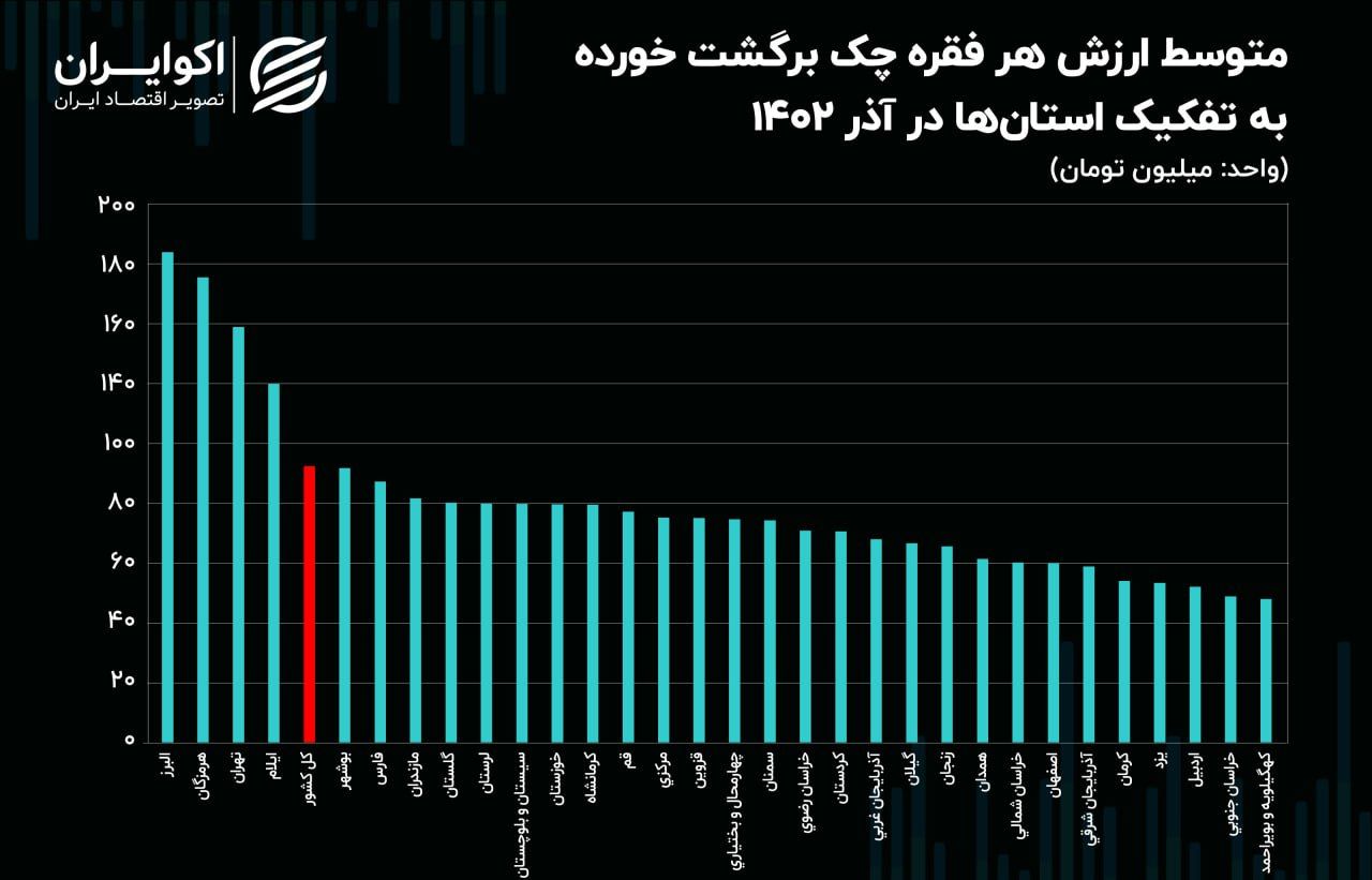 به گزارش بانک مرکزی در آذر 1402 در کل کشور 7 میلیون و 917 هزار فقره چک به ارزش 525 هزار میلیارد تومان صادر شده که از این تعداد 636 هزار فقره به ارزش 65 هزار میلیارد تومان برگشت خورده است. اما میزان برگشت خوردن چک در استانهای مختلف تفاوت دارد. به طوری که بیشترین ارزش هر فقره چک برگشت خورده در استان البرز و کمترین آن در استان کهگیلویه و بویر احمد بوده است. همچنین آمار حاکی از افزایش ارزش هر چک برگشتی در 22 استان نسبت به ماه قبل و افزایش ارزش هر چک برگشتی در همه استانها نسبت به سال قبل است.