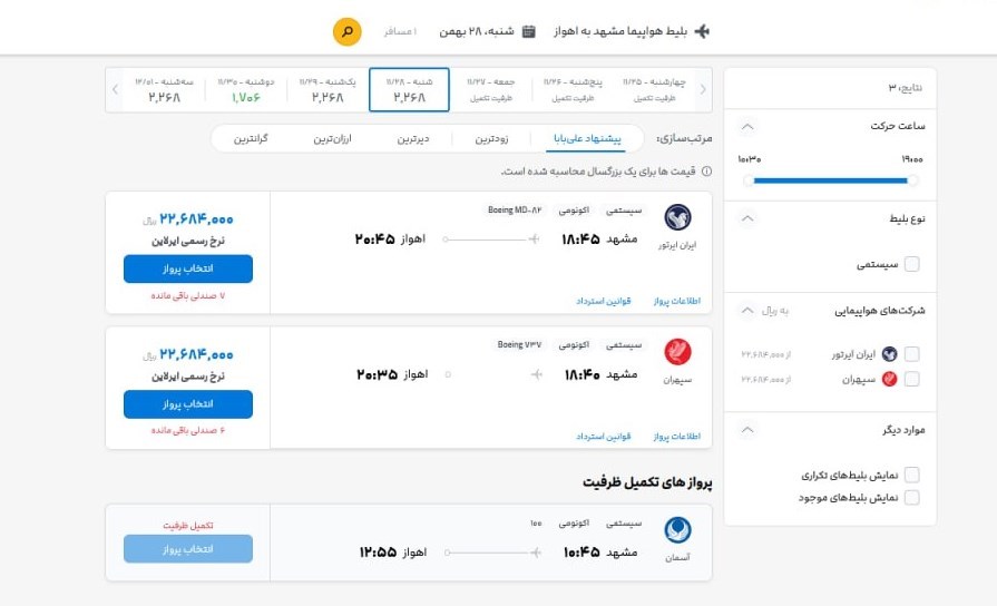 همچنین هواپیمایی سپهران بلیت پرواز مشهد ـ اهواز را با قیمت 2 میلیون و 268 هزار و 400 تومان به فروش میرساند، در حالی که نرخ مصوب این پرواز یک میلیون و 706 هزار و 400 تومان است.