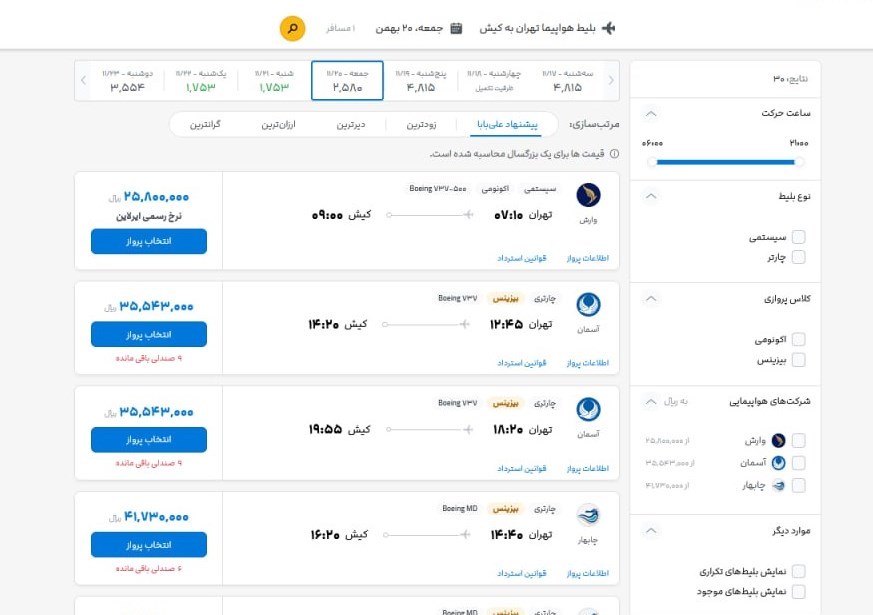 در نمونهای دیگر در حالی قیمت مصوب پرواز تهران ـ کیش یک میلیون و 753 هزار و 600 تومان است که هواپیمایی وارش بلیت این مسیر پروازی را با قیمت 2 میلیون و 580 هزار تومان میفروشد.