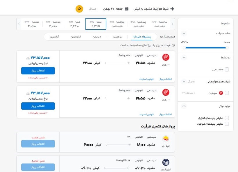 قیمت مصوب بلیت پرواز مشهد ـ شیراز یک میلیون و 757 هزار و 100 تومان است. هواپیمایی ایرانایر تور این بلیت را با قیمت یک میلیون و 958 هزار و 200 میفروشد. نرخ بلیت پرواز مشهد ـ کیش یک میلیون و 803 هزار و 500 تومان است، اما هواپیمایی سپهران آن را با قیمت 2 میلیون و 315 هزار و 700 بهصورت سیستمی به فروش میرساند!