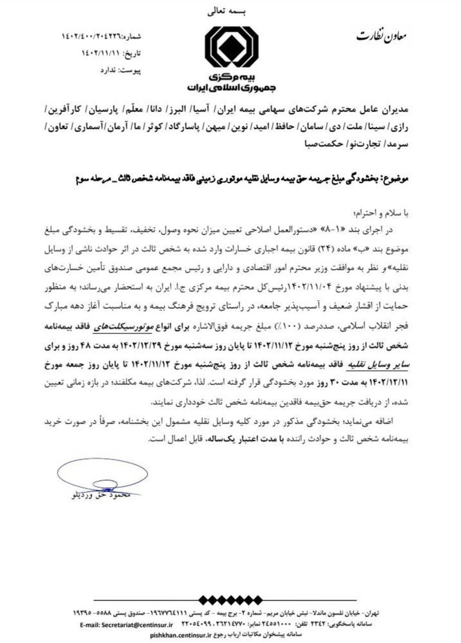بخشنامه بخشودگی ۱۰۰ درصد جرایم کلیه وسایل نقلیه فاقد بیمه شخص ثالث به مناسبت دهه فجر از سوی بیمه مرکزی ابلاغ شد.