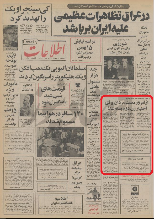 نکته آنکه در شماره روز گذشته این روزنامه هم خبری جالب درباره ازدواج دوم یک مرد آمده است، روزنامه اطلاعات در تاریخ 14 بهمن سال 1353 در خبری کوتاه به این موضوع اشاره کرده و نوشته است: «زن دوم در صورت اطلاع از ازدواج قبلی شوهرش، زندانی خواهد شد.»