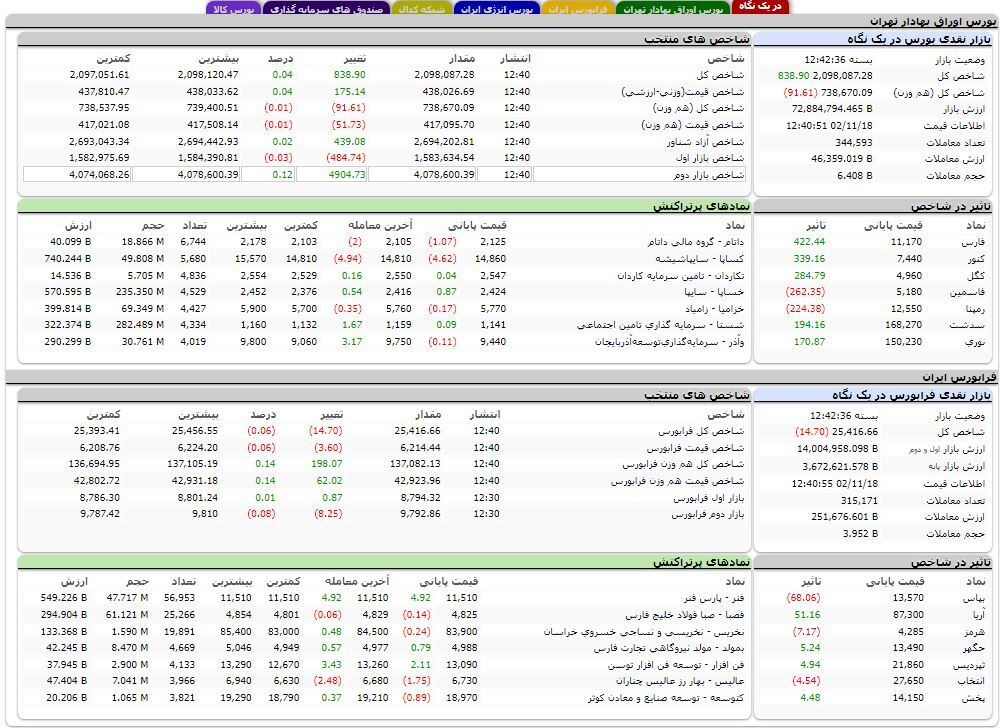 شاخص کل بورس اوراق بهادار تهران در پایان معاملات امروز (چهارشنبه) بازار سهام، با ۸۳۸ واحد افزایش معادل چهار صدم درصد به دو میلیون و ۹۸ هزار و ۸۷ واحد رسید.