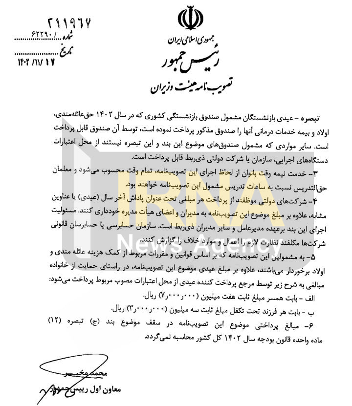 معاون اول رئیس جمهور تصویبنامه هیأت وزیران در خصوص اعطای پاداش پایان سال (عیدی) کارکنان دولت و بازنشستگان کشوری و لشکری را به دستگاههای مربوطه ابلاغ کرد.