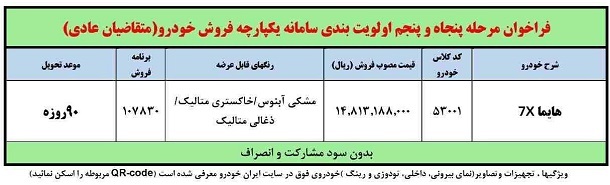 فراخوان واریز وجه و ثبت نام خودروی هایما 7X از سوی شرکت ایران خودرو، اطلاع رسانی شد.