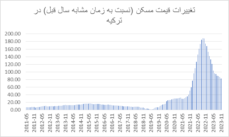 نمودار زیر تغییرات قیمت مسکن (نسبت به زمان مشابه سال قبل) در ترکیه را نشان میدهد.