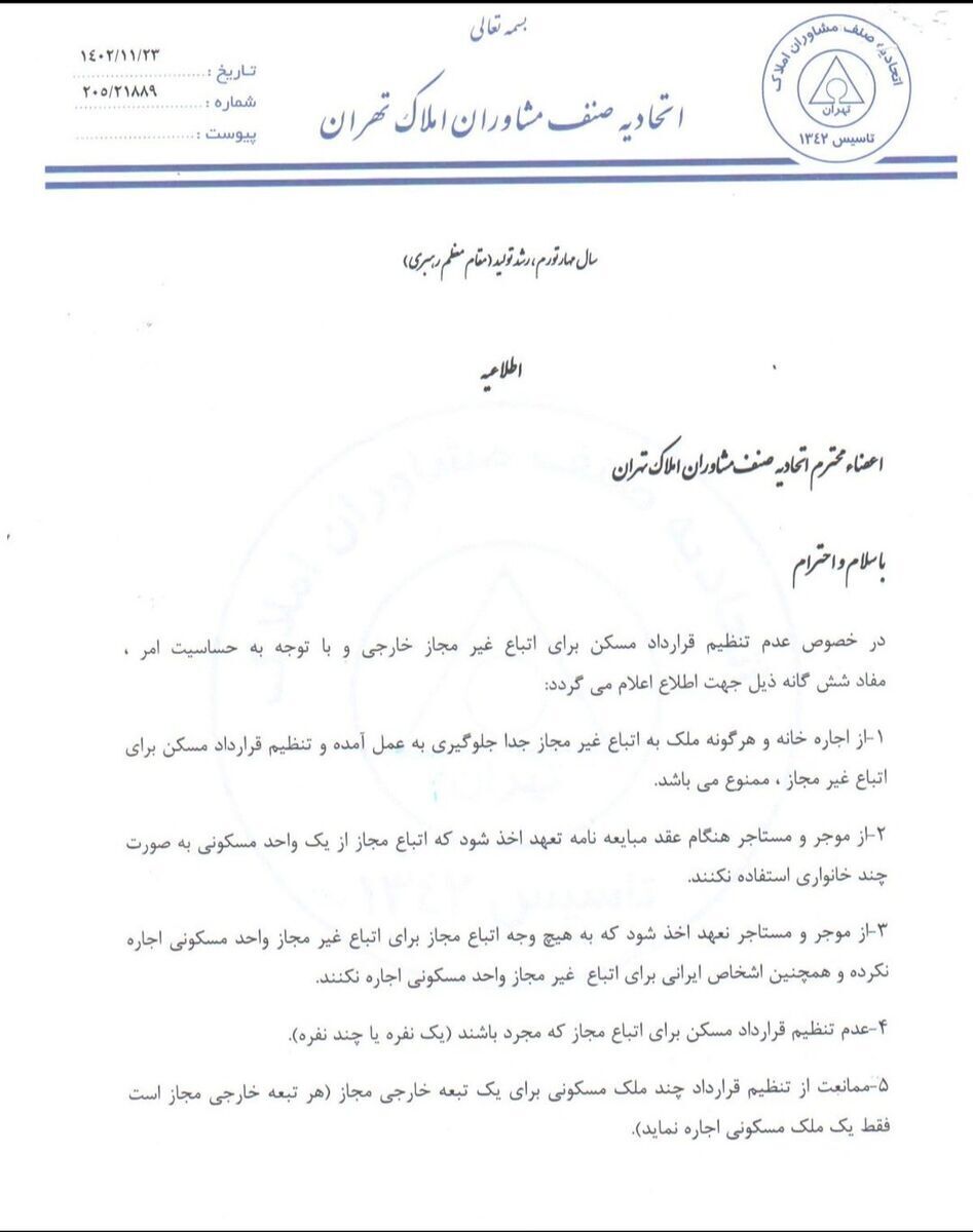 رئیس اتحادیه مشاوران املاک تهران تاکید کرد: تنظیم قرارداد مسکن برای اتباع مجاز که دارای مدرک اقامتی از سایر استان های کشور هستند هم ممنوع است.