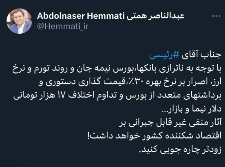 همتی: آقای رئیسی زودتر چاره جویی کنید+ تصویر