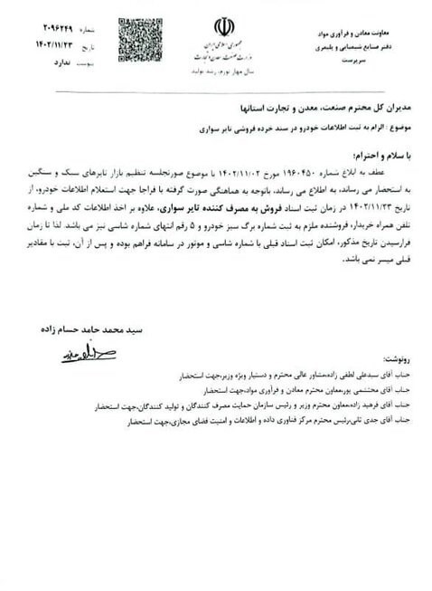 عطف به ابلاغ شماره ۱۹۶۰۴۵۰ مورخ ۱۴۰۲/۱۱/۰۲ با موضوع صورتجلسه تنظیم بازار لاستیک خودرو سبک و سنگین به استحضار میرساند، به اطلاع میرساند با توجه به هماهنگی صورت گرفته با فراجا جهت استعلام اطلاعات خودرو، از تاریخ ۱۴۰۳/۱۱/۲۳ در زمان ثبت اسناد فروش به مصرف کننده تایر سواری علاوه بر اخذ اطلاعات کد ملی و شماره تلفن همراه خریدار فروشنده ملزم به ثبت شماره برگ سبز خودرو و ۵ رقم انتهای شماره شاسی نیز است. لذا تا زمان فرارسیدن تاریخ مذکور امکان ثبت اسناد قبلی با شماره شاسی و موتور در سامانه فراهم بوده و پس از آن ثبت با مقادیر قبلی میسر نیست.