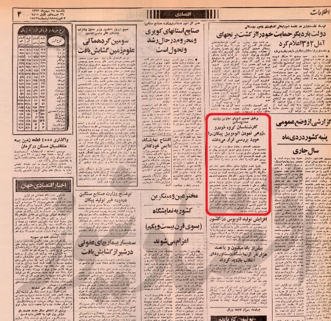 در بخش دیگر این مطلب، آمده است: «بر طبق این گزارش، شورای معاونین وزارت صنایع سنگین در طی چهار جلسه در دی ماه سال جاری، ضمن بررسی مسئله زرهی نبودن اتومبیل سواری پیکان، درباره خدماتی که باید به دارندگان موافقت اصولی داده شود، ریشه کن کردن بی سوادی در واحدهای تحت پوشش، تبدیل اتومبیل های شورلت و پاژرو که در اختیار معاونت هاست به اتومبیل پیکان و تعیین هیات کارشناسان متعهد جهت اجرای اصل ۴۹ قانون اساسی در محدوده وزارت صنایع سنگین، در مورد برخی از مسایل اجرایی و رفاهی آن وزارتخانه نیز تصمیماتی اتخاذ کرد.»