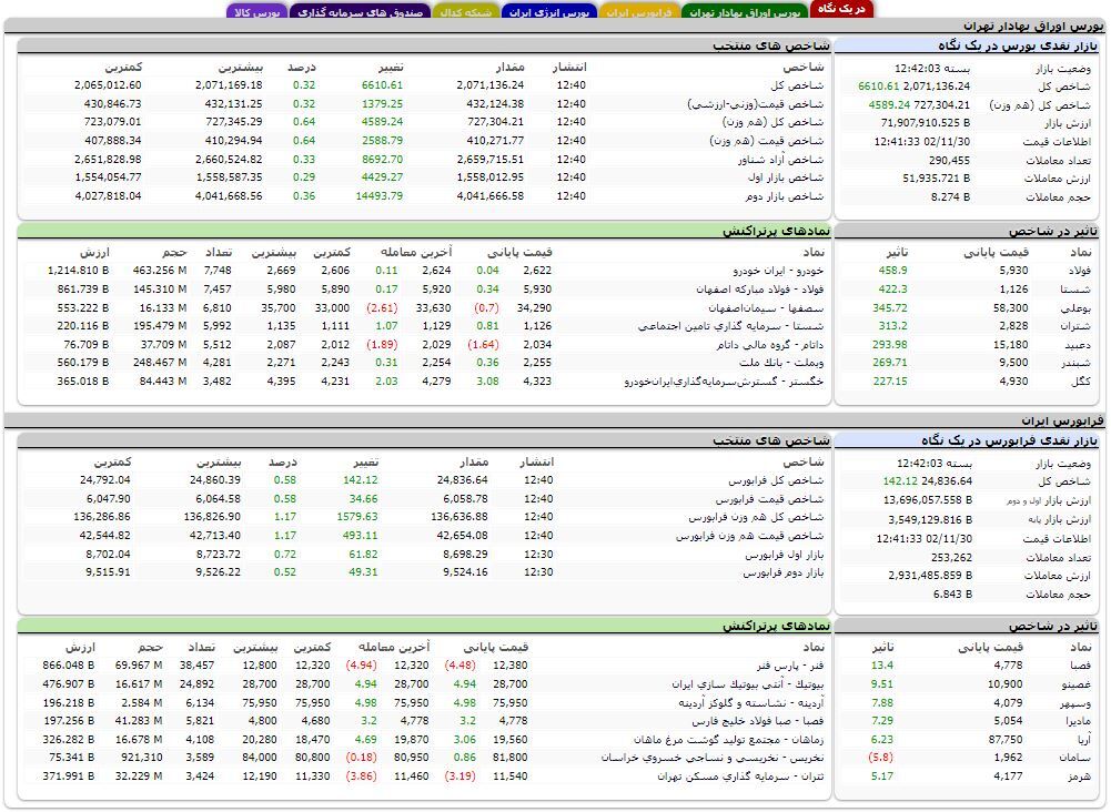 شاخص کل بورس اوراق بهادار تهران در پایان معاملات امروز (دوشنبه) بازار سهام، با ۶ هزار و ۶۱۰ واحد افزایش معادل ۳۲ صدم درصد به دو میلیون و ۷۱ هزار و ۱۳۶ واحد رسید.