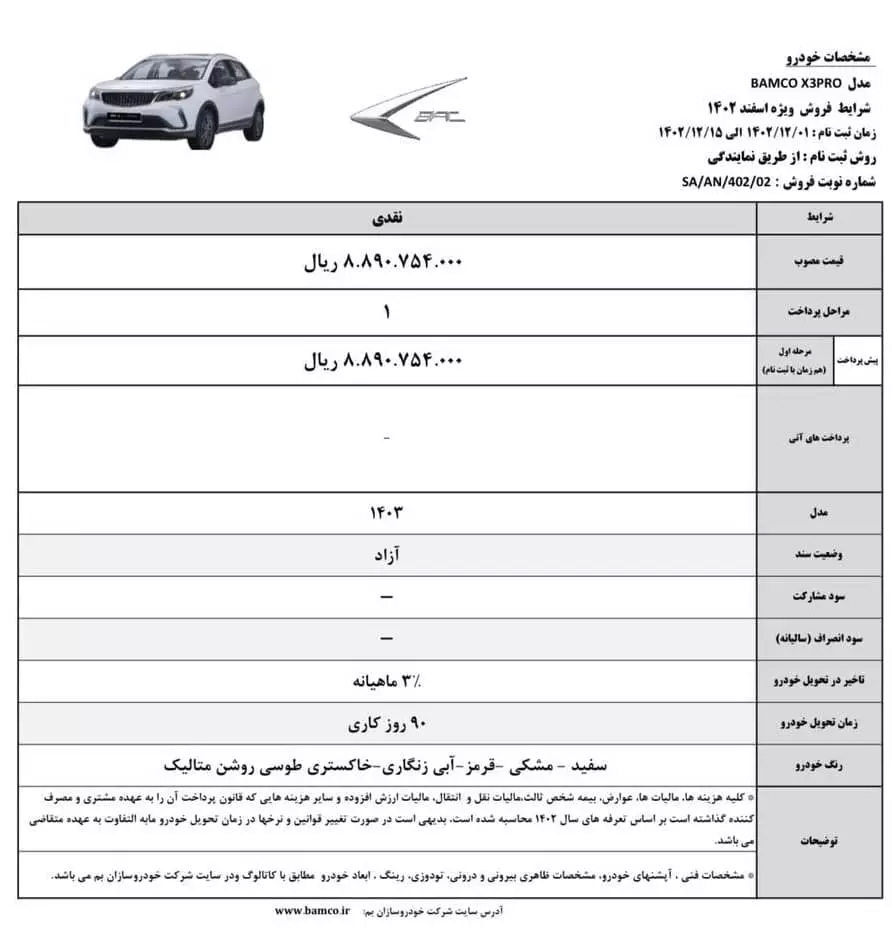 شرکت کرمان موتور در این طرح شاسی بلند بک ایکس ۳ پرو را با قیمت مصوب ۸۸۹ میلیون و ۷۵ هزار و ۴۰۰ تومان در مدل ۱۴۰۳ به متقاضیان عرضه می‌کند. متقاضیان می‌توانند این خودرو را در رنگ‌های سفید، مشکی، قرمز، آبی زنگاری، خاکستری طوسی روشن متالیک خریداری کنند. همچنین نرخ تاخیر در تحویل ۳ درصد ماهیانه و زمان تحویل خودرو نیز ۹۰ روز کاری اعلام شده است.