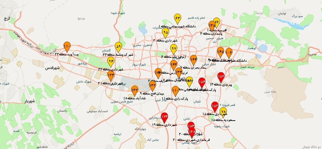 بر اساس جدول رنگبندی شرکت کنترل کیفیت هوا، ایستگاههای سبزرنگ شرایط "پاک"، زردرنگ شرایط "قابل قبول"، نارنجیرنگ شرایط "ناسالم برای گروههای حساس"، قرمزرنگ شرایط "ناسالم" و بنفشرنگ شرایط "بسیار ناسالم" را نشان میدهد.