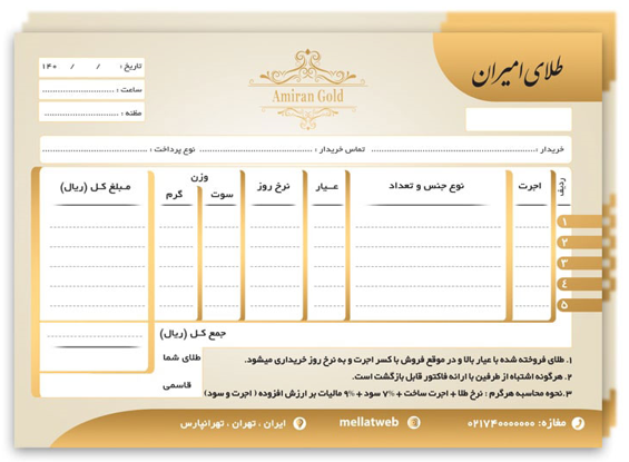 سربرگ: این بخش باید شامل نام و آدرس طلافروش، شماره تماس و شماره فاکتور یا شمارهسریال باشد.