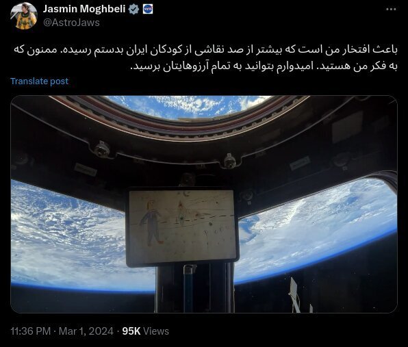 یاسمین مقبلی نقاشیهایی را که کودکان ایرانی برایش فرستاده بودند، در پسزمینه زیبایی از کره زمین در ایستگاه فضایی بینالمللی به نمایش گذاشت.