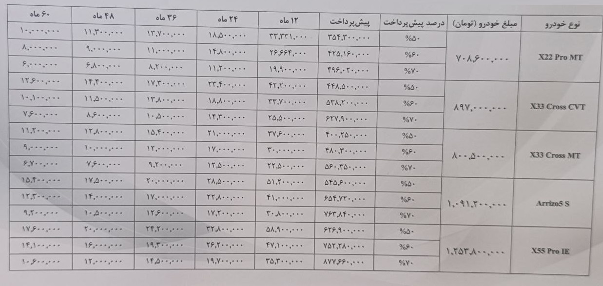 شرایط طرح فروش اقساطی 5 محصول مدیران خودرو اسفند 1402 شامل ایکس 22 پرو ، ایکس 33 ، ایکس 33 کراس ، آریزو 5 و ایکس 55 پرو اعلام شد.