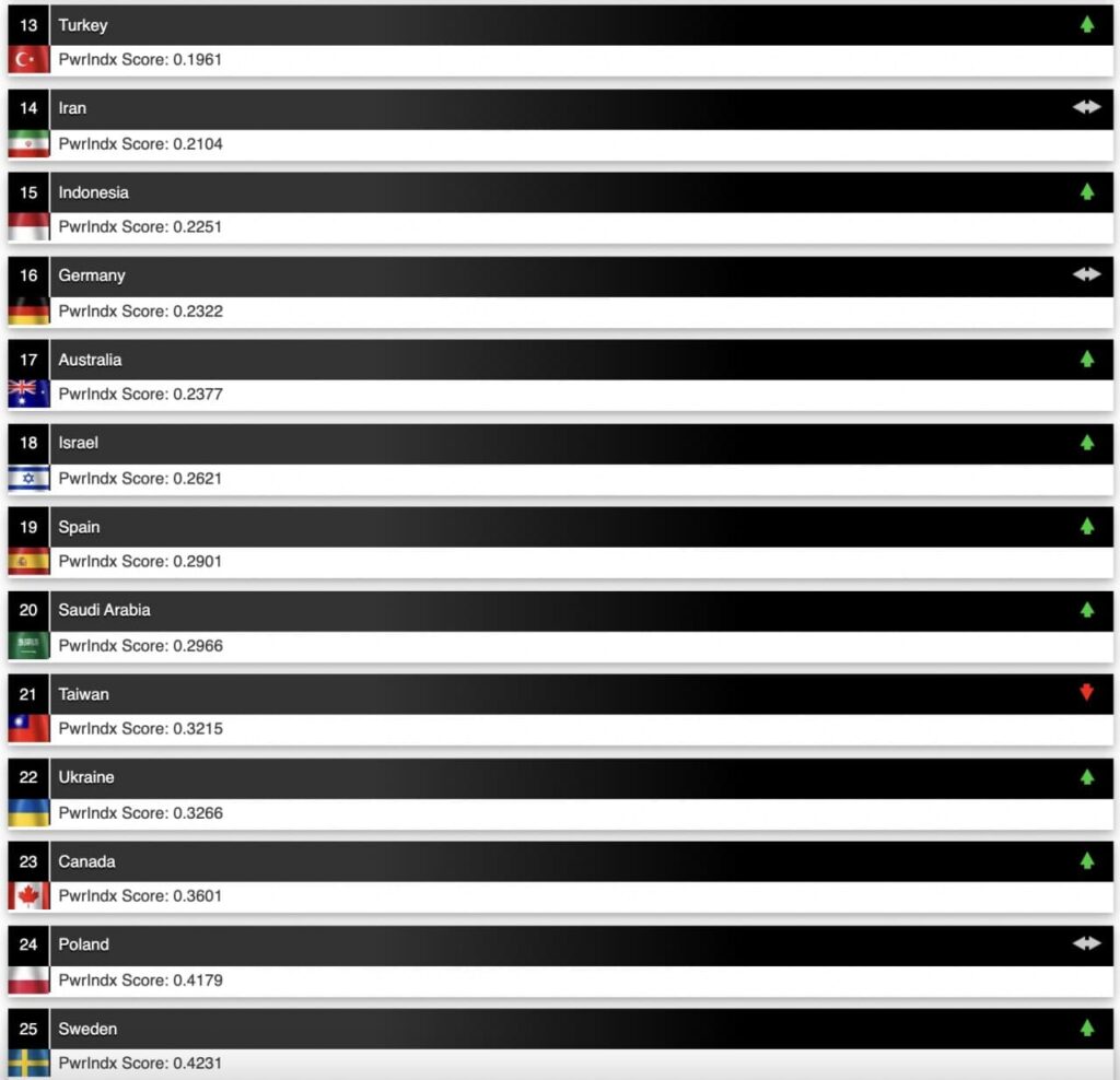 به گزارش سایت طلا، ردهبندی جدید منتشر شده از سوی سایت تحلیلی گلوبال فایرپاور، ایران را بالاتر از برخی کشورهای غربی و در رتبه ۱۴ دستهبندی کرده است. این وبسایت تخصصی نظامی، ایران را در ردهبندی قدرت نظامی از میان ۱۴۵ کشور بر مبنای بیش از ۶۰ شاخص در رتبه چهاردهم قرار داد.