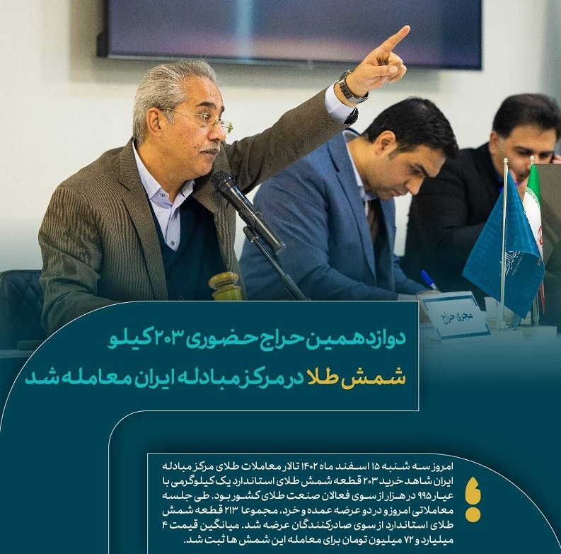 دوازدهمین حراج حضوری شمش طلا در مرکز مبادله ارز و طلای ایران با معامله ۲۰۳ قطعه شمش یک کیلوگرمی به پایان رسید.