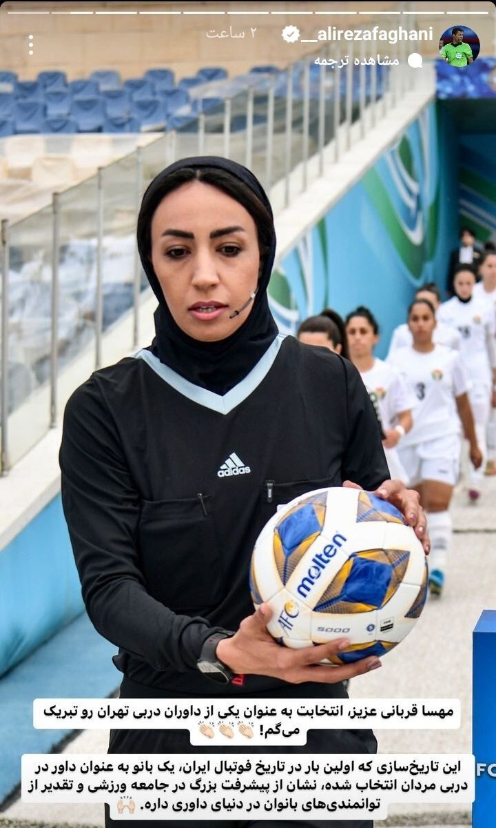 علیرضا فغانی داور مطرح کشورمان با انتشار یک استوری به انتخاب داور زن برای دربی واکنش نشان داد و به مهسا قربانی تبریک گفت.