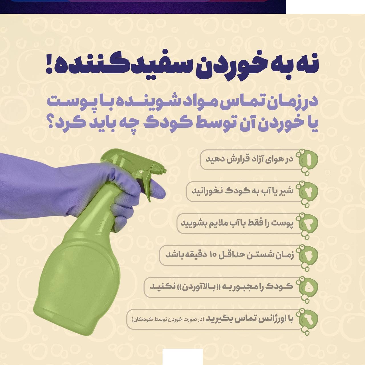 بنابر اعلام سازمان غذا و دارو، حسینی نسبت به استفاده نابجا و بدون آگاهی از مواد شوینده و پاک کنندههای شیمیایی که میتواند خطرات جبرانناپذیری بر سلامت وارد کند، هشدار داد و گفت: از قرار دادن مواد شوینده، گندزدا و الکل در کمدهای زیر ظرفشویی اجتناب کنید، خطر مسمومیت در کودکان نوپا و کنجکاو از این طریق بسیار بالا است. لذا این محصولات باید دور از دسترس اطفال نگه داشته شود.
