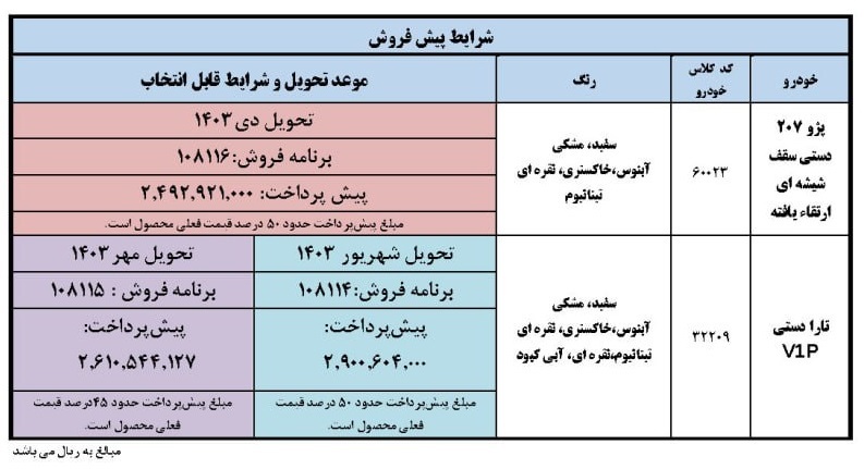 به گزارش سایت طلا، شرایط طرح فروش نقد و اقساطی ایران خودرو اسفند 1402 شامل سورن پلاس، پژو 207 و تارا دستی اعلام شد.