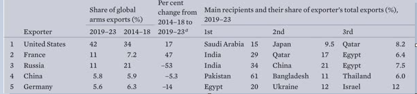 روسیه: این کشور در بازه زمانی چهار ساله ۲۰۱۴-۲۰۱۸ مالک ۲۱% کل صادرات نظامی جهان بود. این عدد در بازه زمانی چهار ساله ۲۰۱۹-۲۰۲۳ به عدد ۱۱% رسید که نشان دهنده ۵۳% کاهش در صادرات نظامی این کشور است. هند (۳۴%)، چین (۲۱%) و مصر (۷/۵%) بزرگترین مقاصد صادرات تسلیحات روسیه هستند.