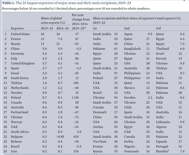 آمریکا: این کشور در بازه زمانی چهار ساله ۲۰۱۴-۲۰۱۸ مالک ۳۴% کل صادرات نظامی جهان بود. این عدد در بازه زمانی چهار ساله ۲۰۱۹-۲۰۲۳ به عدد ۴۲% رسید. به عبارتی دیگر، آمریکا ۱۷% رشد صادرات نظامی داشته است. عربستان سعودی (۱۵%)، ژاپن (۹/۵%) و قطر (۸/۲%) بزرگترین مقاصد صادرات تسلیحات آمریکا هستند.