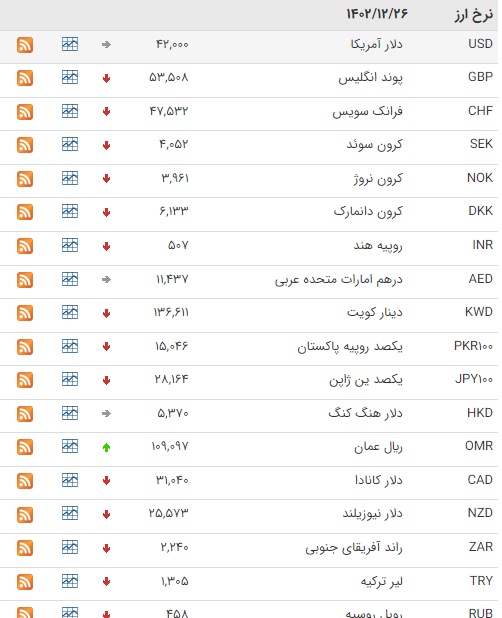 امروز نرخ رسمی ۴۶ ارز را اعلام کرد که بر اساس آن نرخ 6 ارز افزایش و نرخ 35 ارز کاهش یافت، نرخ باقی ارز‌ها ثابت ماند.