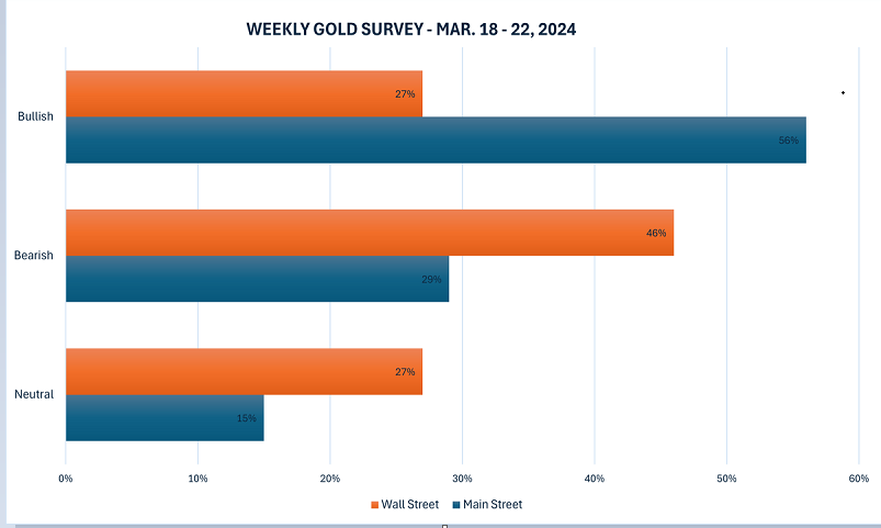 110 تاجر خردهفروشی که 56 درصد را نمایندگی میکنند به دنبال افزایش قیمت طلا در هفته آینده بودند. 54 نفر یا 29 درصد دیگر پیش بینی کردند که این میزان کمتر خواهد بود، در حالی که 30 پاسخ دهنده یا 15 درصد نسبت به چشم انداز کوتاه مدت طلا بی طرف بودند.