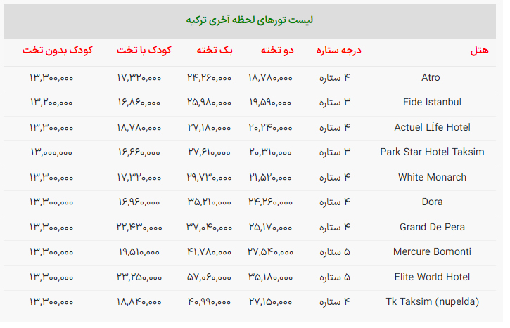 قیمت تورهای لحظه آخری استانبول با جزییات دقیق را در جدول زیر بخوانید؛