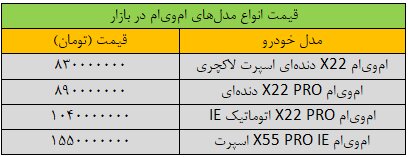 در عین حال، امویام X۲۲ PRO اتوماتیک IE مدل ۱۴۰۲ که هماکنون در بازار خودرو به قیمت یک میلیارد و ۴۰ میلیون تومان فروخته میشود، اول مهرماه ۹۳۰ میلیون تومان قیمت داشت. این خودرو ۱۱۰ میلیون تومان گران شده است.