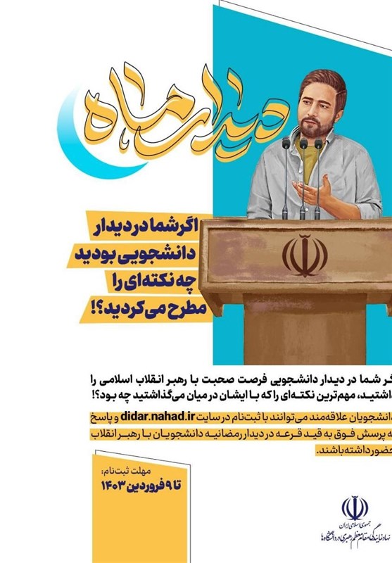 بر اساس این فراخوان دانشجویان علاقه مند به حضور در این دیدار با ثبت نام در سایتdidar.nahad.ir و پاسخ به این سوال اگر شما در دیدار دانشجویی فرصت صحبت با رهبر انقلاب اسلامی را داشتید مهمترین نکته ای را که با ایشان در میان می گذاشتید چه بود؟ به قید قرعه امکان حضور در این دیدار را خواهند داشت.