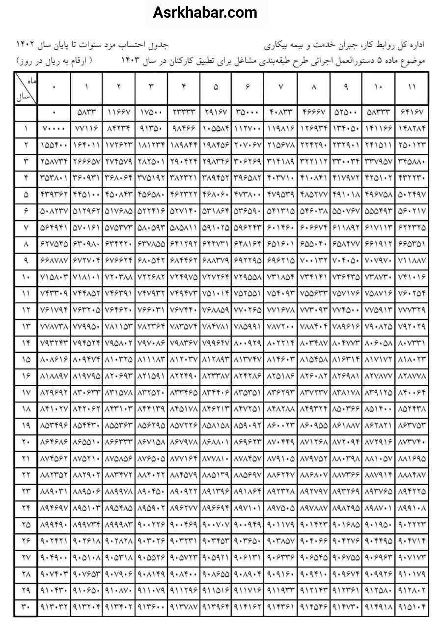 با ابلاغ بخشنامه حداقل دستمزد سال ۱۴۰۳، جدول نحوه محاسبه مزد سنوات تا پایان سال ۱۴۰۲ برای اجرا در سال ۱۴۰۳ از سوی اداره کل روابط کار و جبران خدمت وزارت تعاون، کار و رفاه اجتماعی منتشر شد. این جدول برای کارگرانی است که در کارگاه‌های با طرح طبقه بندی مشاغل مشغول به کار هستند. در گروه‌های ۲۰ گانه نرخ پایه سنوات آنان تا ۳۰ سال سابقه آمده است.