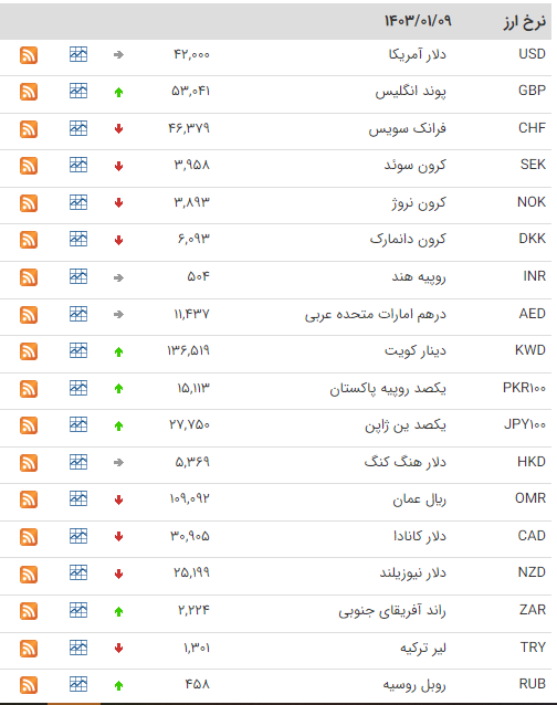 امروز (پنج شنبه 9 فروردین ماه) نرخ هر پوند 53 هزار و 41 ریال و یورو 45 هزار و 443 ریال اعلام شد.