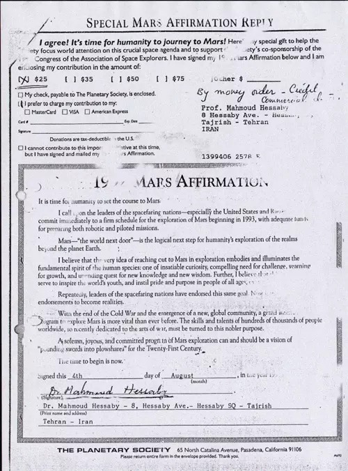 به گزارش انصاف نیوز، پیشتر در سایت بنیاد پروفسور حسابی چیزی به عنوان سند خرید زمین در کره مریخ توسط پروفسور حسابی منتشر شده بود که به همراه متن پیوست آن در پی میآید: