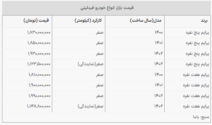 همچنین قیمت فیدلیتی ۵ نفره مدل ۱۴۰۲ در بازار خودرو با رشد ۳۰ میلیونی ۱ میلیارد و ۹۳۰ میلیون تومان شد.