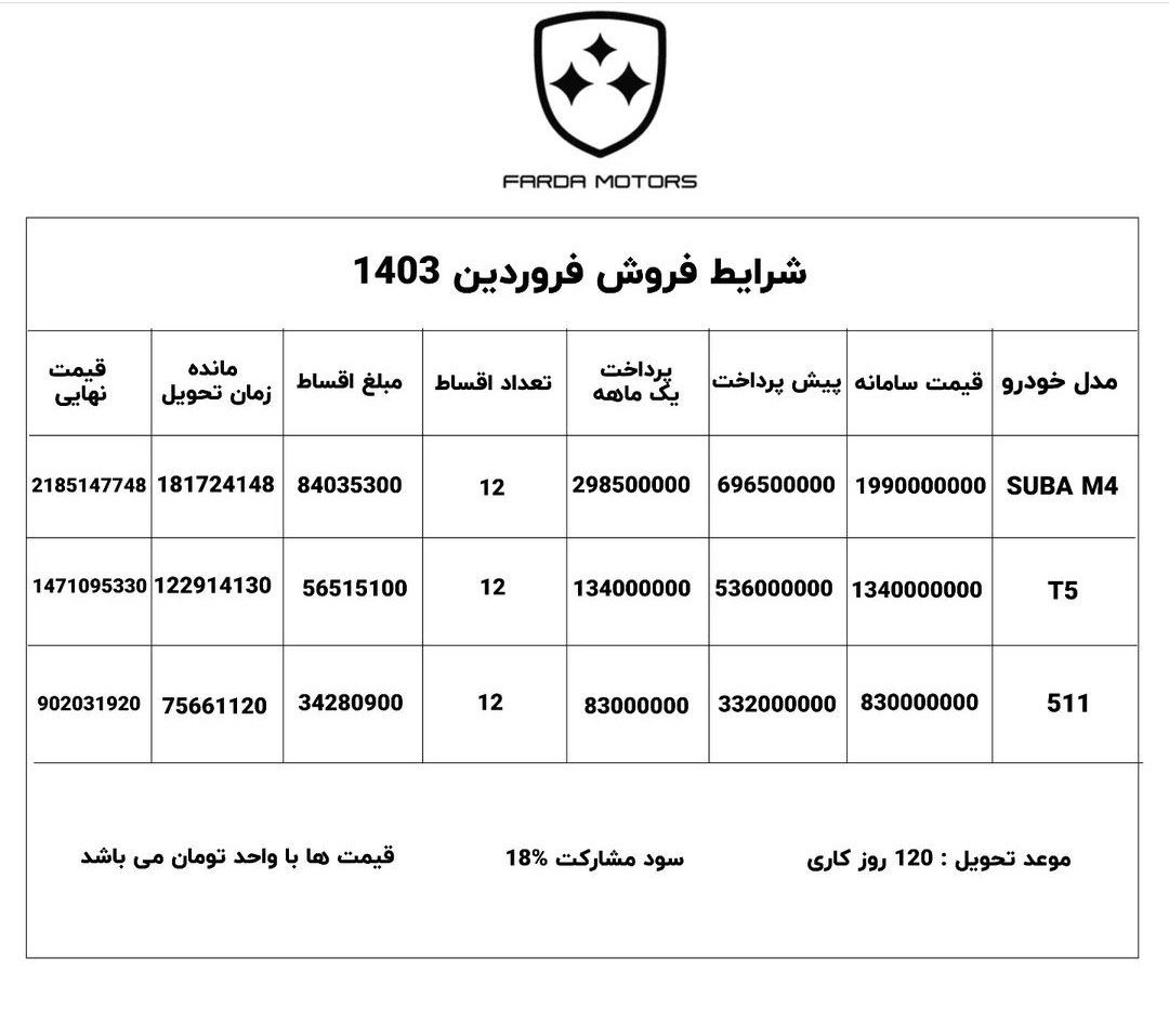 دور جدید فروش خودروهای فرداموتورز در سال ۱۴۰۳ استارت خورد.فروش محدود خودروهای فرداموتورز با قیمت های سال ۱۴۰۲ به صورت محدود انجام می‌شود.