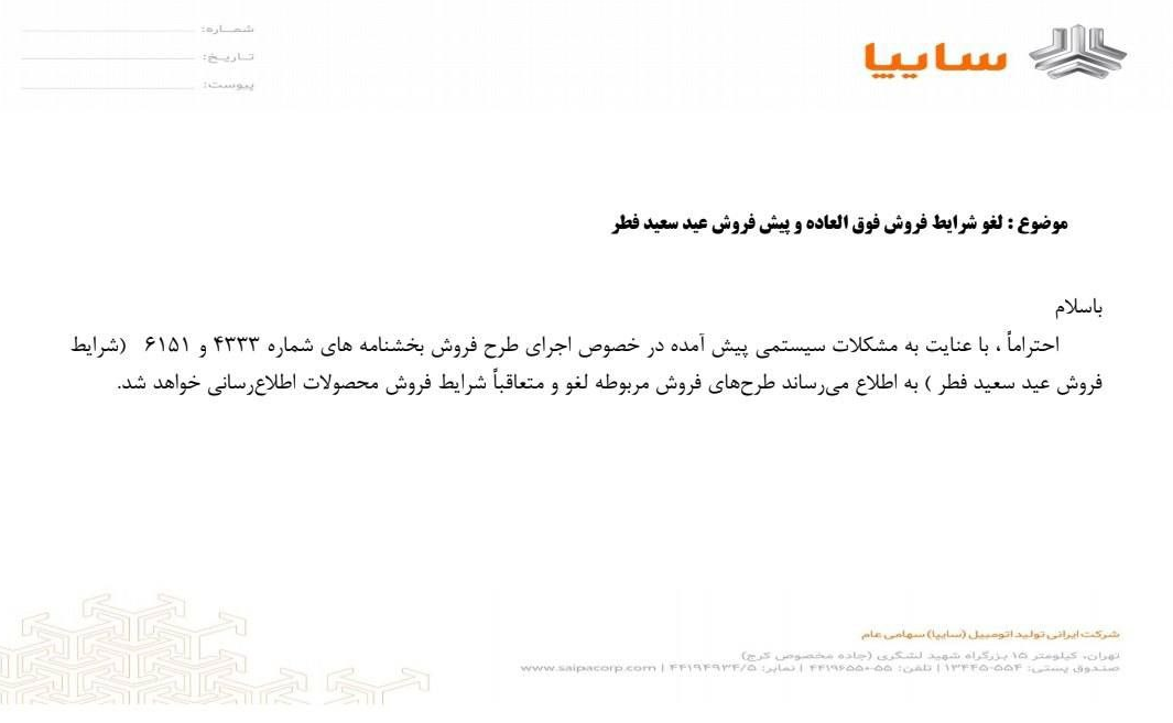 فروش فوق العاده و پیش فروش شرکت سایپا ویژه عید سعید فطر لغو شد.