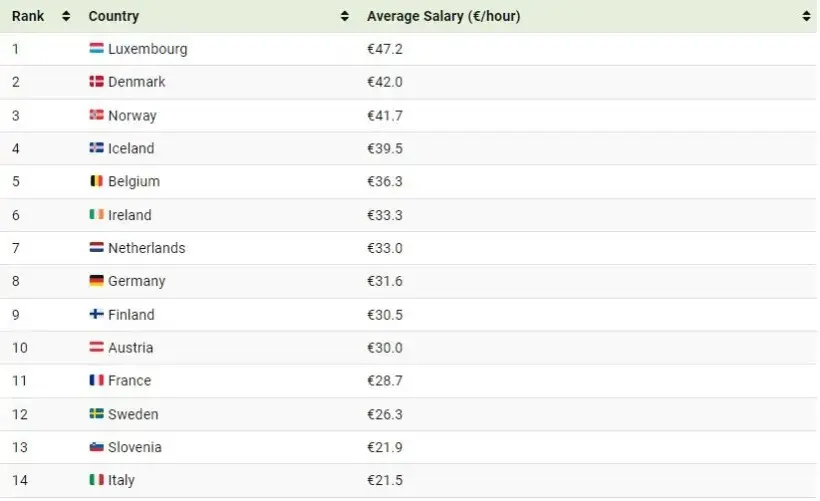 دانمارک و نروژ نیز حقوق بالایی (۴۲ یورو در ساعت) پرداخت می کنند، در حالی که سوئد (۲۶ یورو در ساعت) در میانه این رتبه بندی قرار می گیرد.
