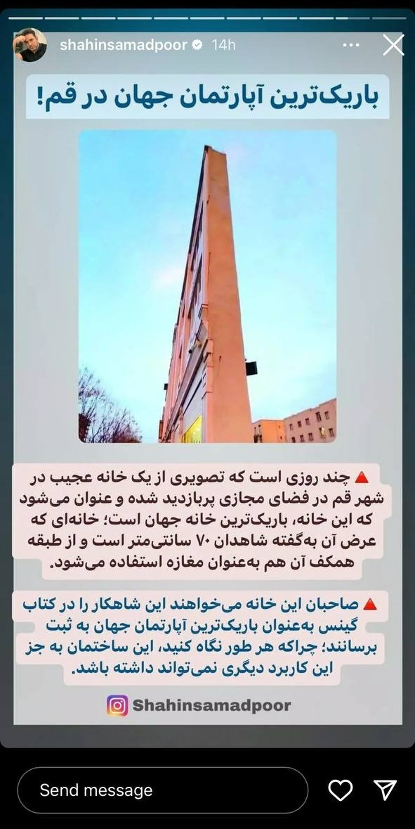شاهین صمدپور در صفحه شخصی خود عکسی از بک ساختمان بسیار باریک واقع در قم منتشر کرد که ظاهرا صاحبان آن به دنبال ثبت در کتاب گینس هستند.