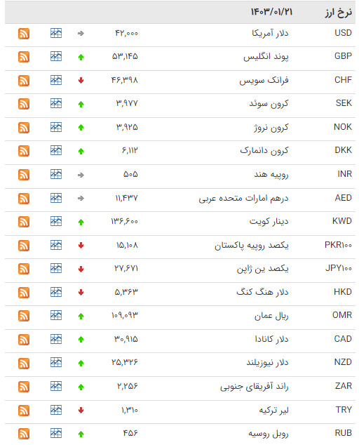 امروز ( سه شنبه 21 فروردین ماه) نرخ هر پوند 53 هزار و 145 ریال و یورو 45 هزار و582 ریال اعلام شد.