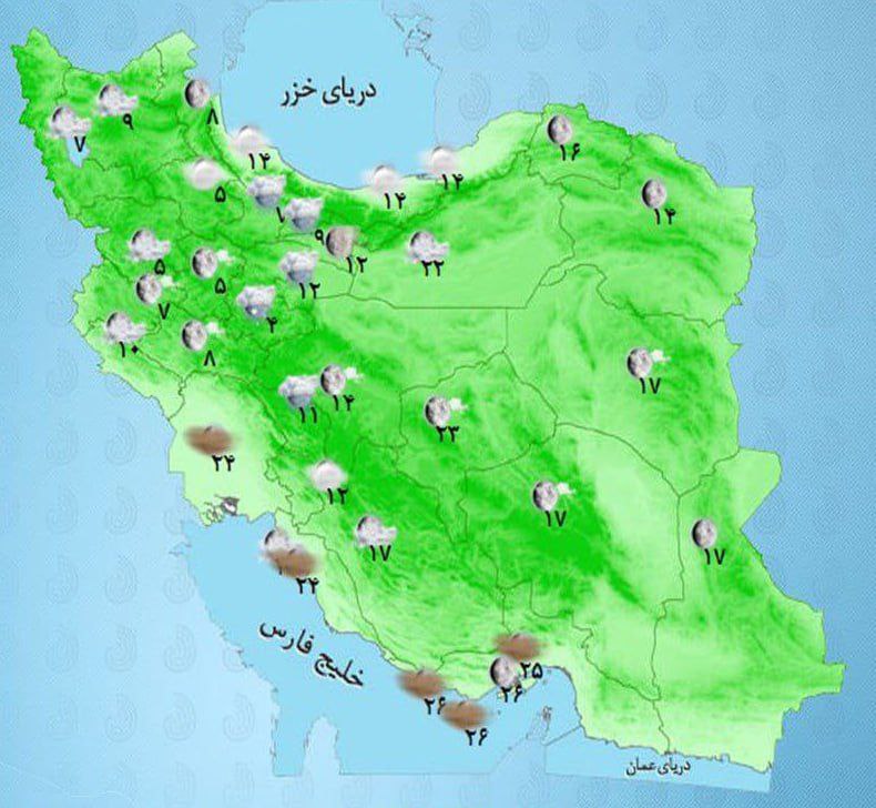 دوشنبه در برخی نقاط شمال غرب، شمال شرق، نیمه جنوبی سیستان و بلوچستان و بعد از ظهر در ارتفاعات البرز مرکزی، ارتفاعات زاگرس مرکزی و استان های آذربایجان غربی و آذربایجان شرقی رگبار باران، گاهی رعد و برق و وزش باد شدید پیش بینی می شود. همچنین از اواخر وقت دوشنبه با نفوذ سامانه بارشی از جنوب کشور، بارش در استان های بوشهر و فارس آغاز خواهد شد.